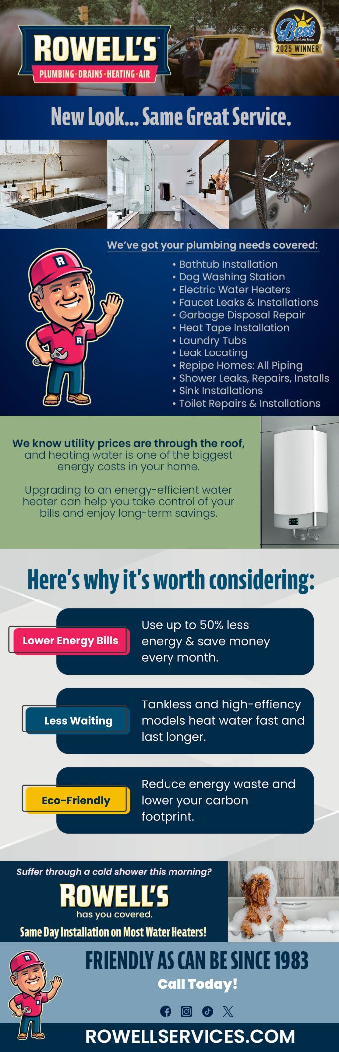 "Friendly As Can Be Since 1983!" When you need help with your plumbing, drains, heating, cooling or electrical in Hopkinton, you can always rely on Rowell's Services! Call us now or book online!