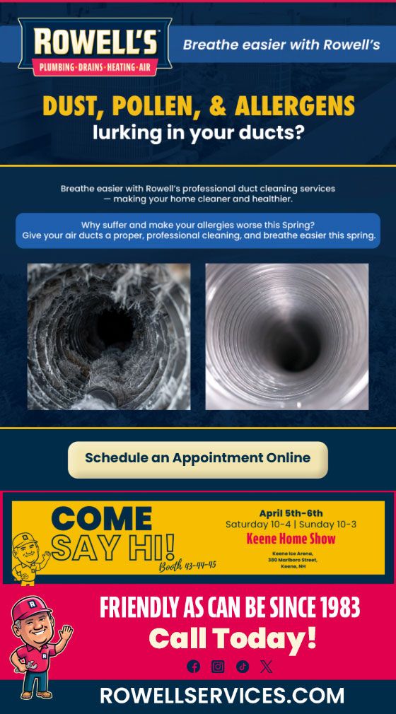 "Friendly As Can Be Since 1983!" When you need help with your plumbing, drains, heating, cooling or electrical in Hopkinton, you can always rely on Rowell's Services! Call us now or book online!